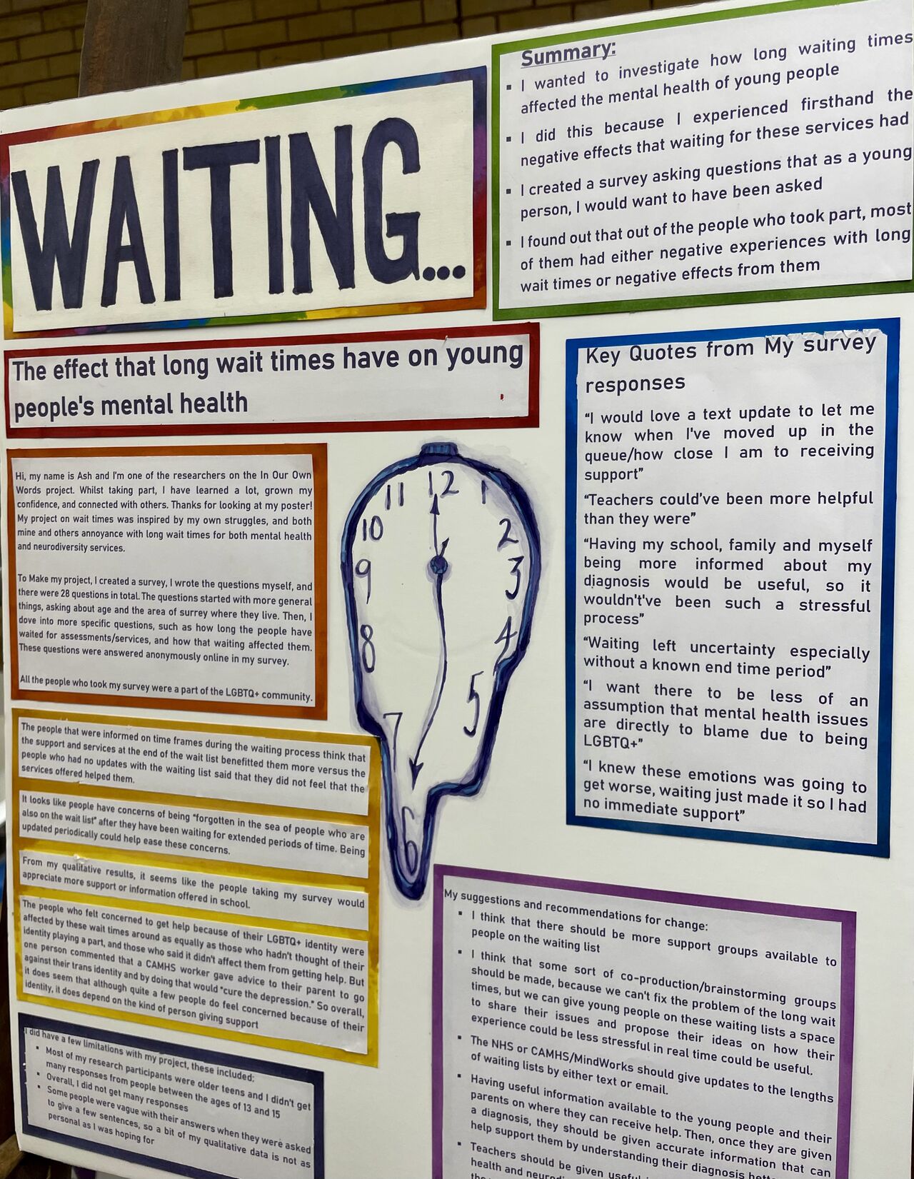 In Our Own Words is a pilot project for neurodivergent young people as lived experience experts. The project trains and supports young people to become researchers to understand other young people’s experiences of mental health and wellbeing as well as mental health services. It’s a peer-led project where young people lead their own research and decide what areas of mental health and wellbeing they want to investigate, inspired by their own passions. This is important as it gives power and voice to the community the research is about and makes sure that the findings are accurate and helpful to them. It’s all about doing research with people instead of about them.
